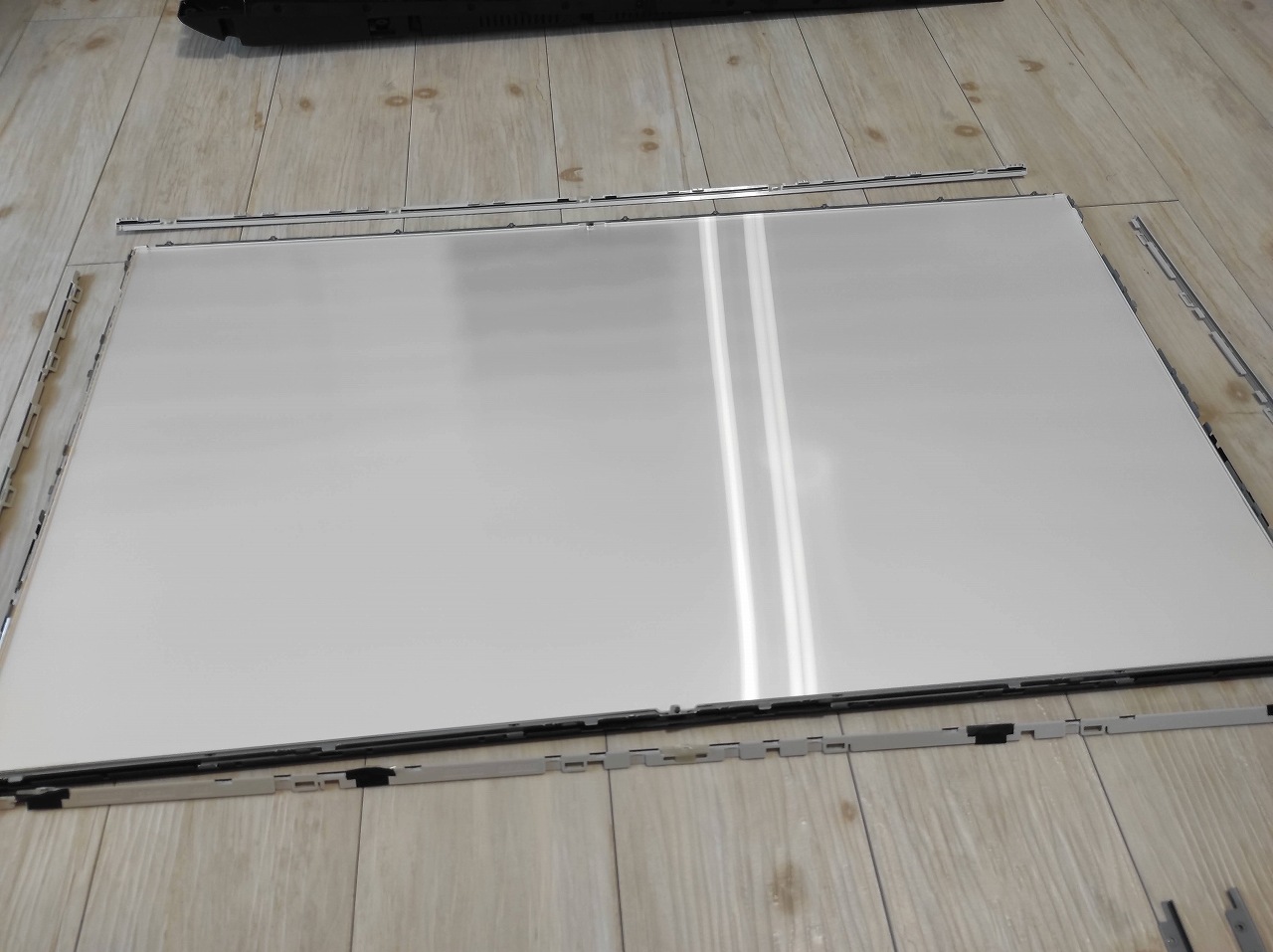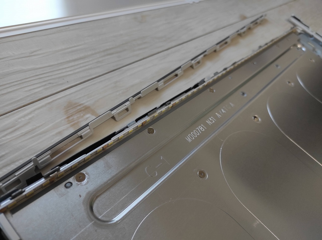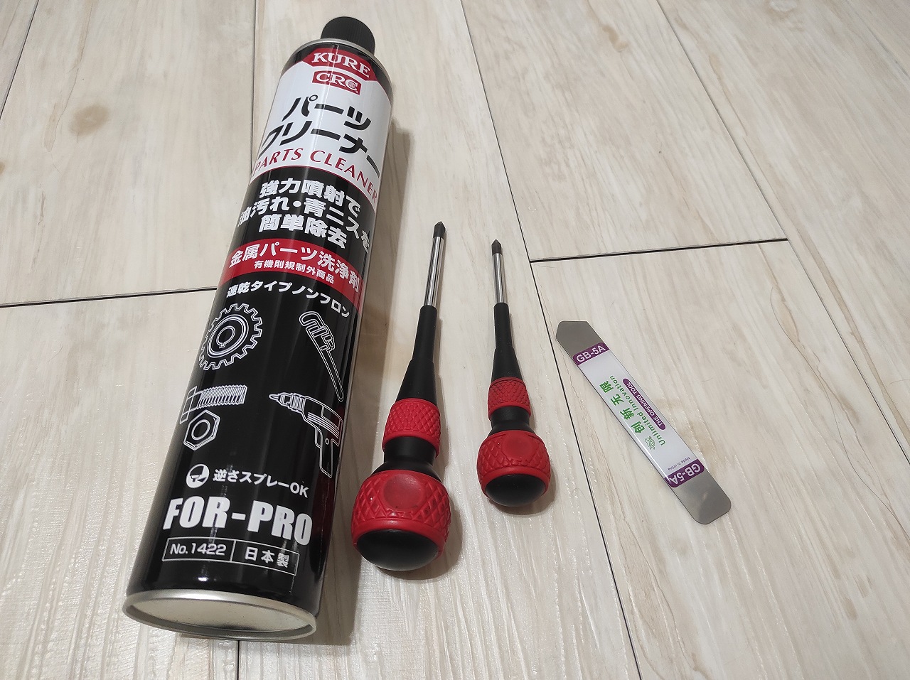 パーツクリーナーは古いバックライトを外した時に掃除するために使います。古いバックライトの粘着質が残っていると放熱板とバックライトが密着せず、せっかく交換したバックライトがすぐに故障なんてことになりかねません。私はパーツクリーナーを吹き付けてキッチンペーパーと歯ブラシで完全に除去しました。