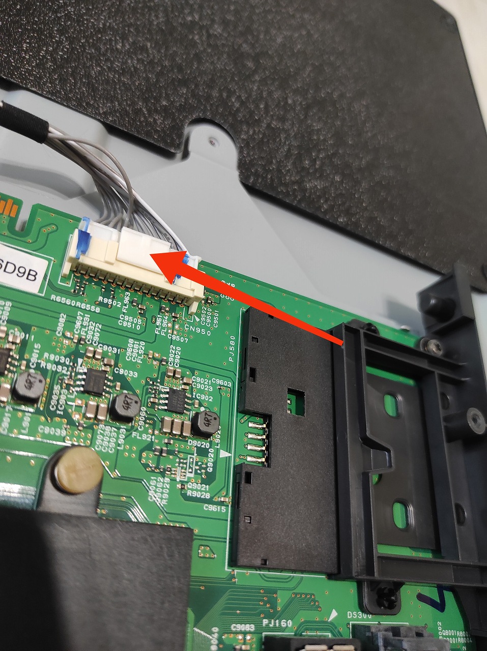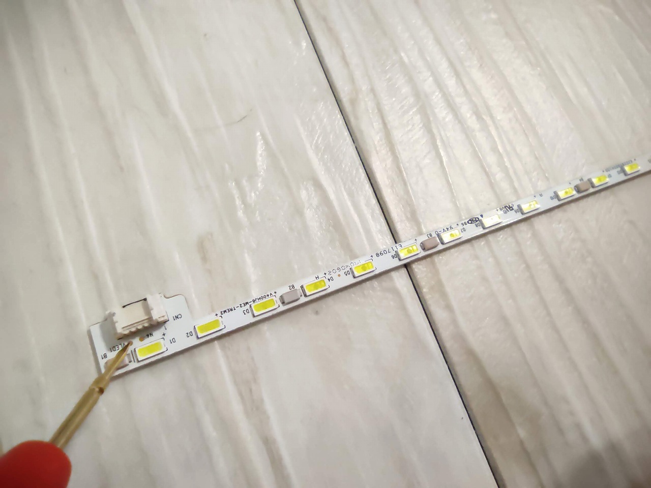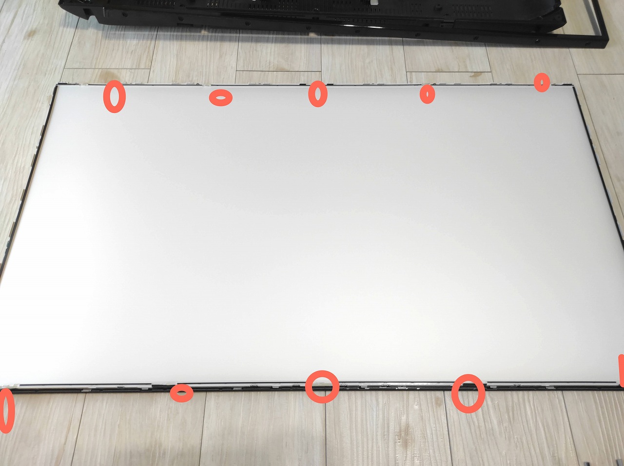 最近このサイトを見て修理しようとして失敗したと思われるブログを見ました。画面全体のバックライトが完全に光っていない場合、先ず疑うのはケーブルとコネクタの接触不良です。バックライトと基板側のケーブルコネクタ足にテスターを当てて通電チェックをしてください。通電していない場合は基板側とバックライト側のコネクタを抜いて磨いたり掃除してから接点復活剤を使ってテストして下さい。バックライトから基板まで導通しているのにバックライトがつかない場合で初めて基板故障が疑われます。
